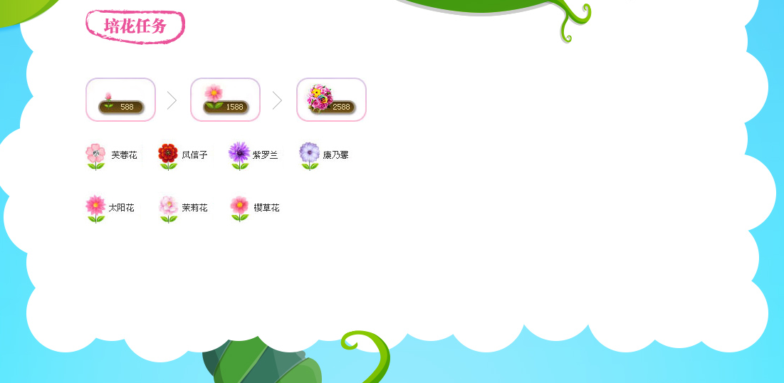 一共分为3个阶段,花芽-开花-花海,只要送出阳光和阳光卡,即可帮助主播完成任务,每天的花都是不同的喔!