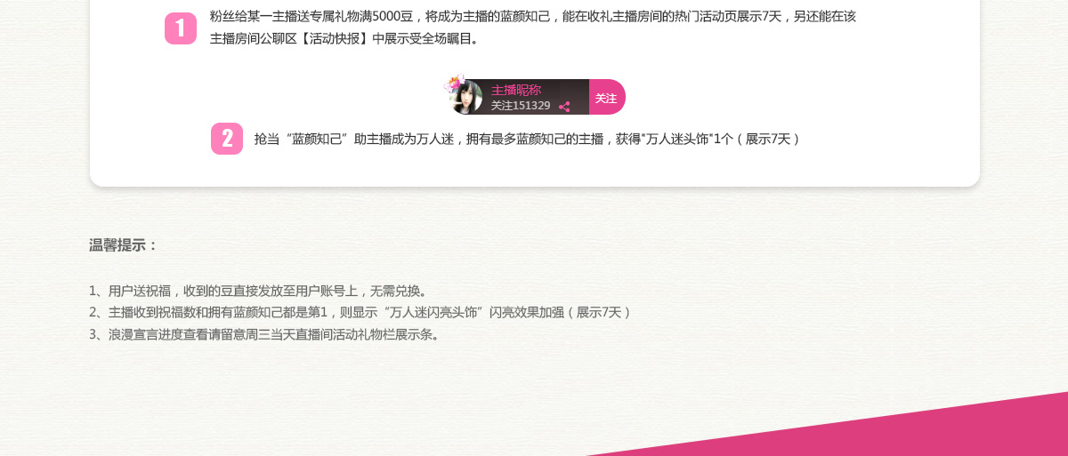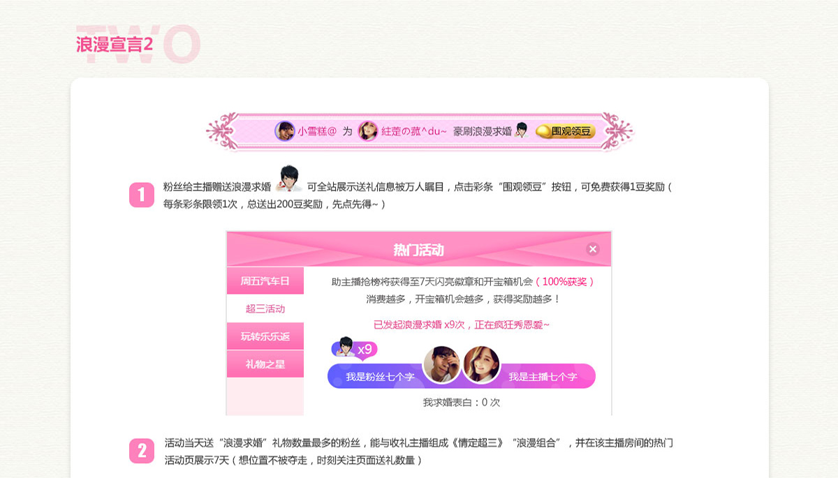 *活动祝福=获得祝福次数*20。例如主播获得求婚祝福次数2次,则分值为40